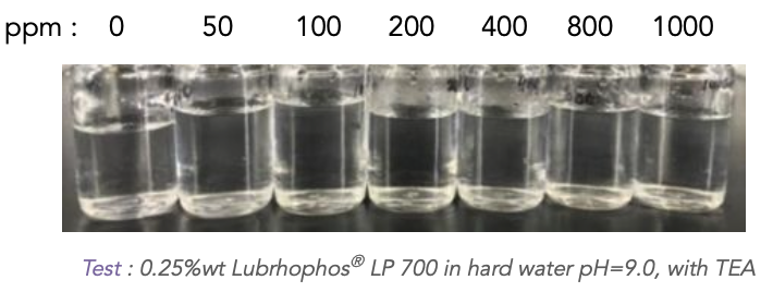 Lubrhophos LP 700 is very stable in hard water and shows a clear solution at 0.25% wt up to 1000 ppm of water hardness